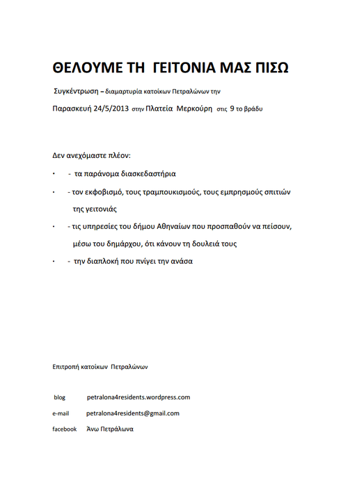 Συγκέντρωση: θέλουμε τη γειτονιά μας πίσω