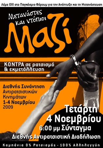 Η κίνηση Ενωμένοι ενάντια στο Ρατσισμό και τη Φασιστική Απειλή σας καλεί να στηρίξουμε με αποφασιστικότητα τη βδομάδα δράσης κατά του Παγκόσμιου Φόρουμ Μετανάστευσης και Ανάπτυξης. Για να πετύχουν οι κινητοποιήσεις με μαζική συμμετοχή εργαζόμενων και νέων με τα συνδικάτα, τους φοιτητικούς συλλόγους, τις μαθητικές κοινότητες, τις κινήσεις γειτονιάς, τις πρωτοβουλίες δικαιωμάτων στο πλευρό των κοινοτήτων των μεταναστών.