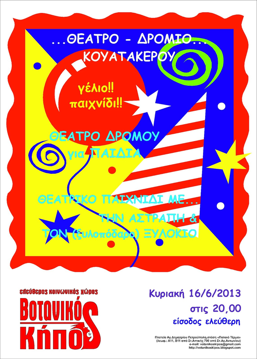Η θεατρική ομάδα "Θεατροδρόμιο Κουατακερού", που αποτελείται από τους ηθοποιούς Αλέξη Μαρτζούκο και Δήμητρα Σκλάβου, παρουσιάζει θέατρο δρόμου για παιδιά ή.... για όσους νιώθουν παιδιά, με παιχνίδια, σκετσάκια, παντομίμα και ξυλοπόδαρο.