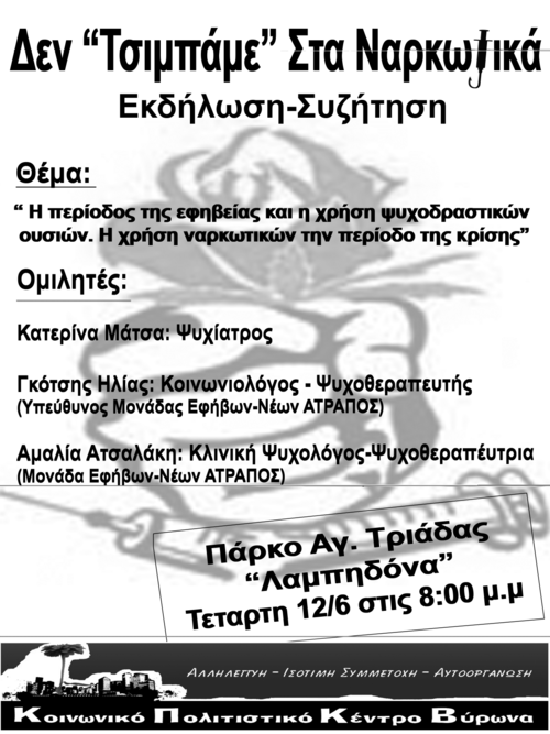 Την Τετάρτη 12/6/2013 στις 8.00 το απόγευμα συζητάμε, στον κοινωνικό χώρο της Λαμπηδόνας για την εφηβεία, και την οικογένεια, για τις αιτίες του φαινομένου της χρήσης ναρκωτικών ουσιών, για τις δυνατότητες παρεμβάσεων και το ρόλο της εκπαίδευσης και των κοινωνικών σχέσεων.