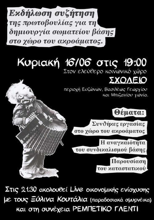 Την Κυριακή 16/06 στον Ελεύθερο Κοινωνικό Χώρο σχολείο στις 19:00, θα πραγματοποιηθεί εκδήλωση-συζήτηση με θεματα: Το ιστορικό της πρωτοβουλίας εργαζομένων στο ακρόαμα και τις συνθήκες εργασίας στον κλάδο, την αναγκαιότητα του συνδικαλισμού βάσης και την παρουσίαση του καταστατικού του σωματείου που πρόκειται να γινει.