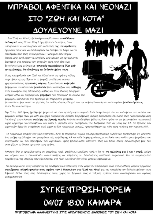 Πρωτοβουλία αλληλεγγύης στους απολυμένους διανομείς του Ζωή και κότα