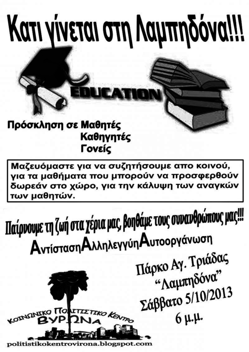 Η νέα σχολική χρονιά που μόλις ξεκίνησε(;) βρίσκει την παιδεία στην χειρότερη κατάσταση των τελευταίων δεκαετιών. Η κυβέρνηση, πιστή στις υποσχέσεις απέναντι στους εντολοδόχους της, συγχωνεύει και κλείνει σχολικές μονάδες, καταργεί εκπαιδευτικούς τομείς, απολύει εκπαιδευτικούς. Ο θεσμός της Παιδείας ως Δημόσιο και Κοινωνικό αγαθό καταλύεται και μεγάλα τμήματα της κοινωνίας αποκλείονται από την εκπαιδευτική διαδικασία. Και όλα αυτά συμβαίνουν στο φόντο της γενικής απογύμνωσης της ζωής από κάθε στοιχείο με συλλογικά - δημόσια χαρακτηριστικά, σε μια προσπάθεια συντήρησης και αναστύλωσης ενός μοντέλου ζωής που καταρρέει.