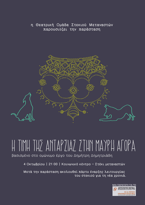 Η παράσταση «Η Τιμή της Ανταρσίας στην Μαύρη Αγορά» λίγο... αλλιώς, από τη Θεατρική Ομάδα Στεκιού (βασισμένη στο ομώνυμο θεατρικό έργο του Δημήτρη Δημητριάδη) στο Κοινωνικό Κέντρο / Στέκι Μεταναστών την Παρασκευή 4 Οκτωβρίου στις 21:00. Μετά την παράσταση θα ακολουθήσει πάρτι ανοίγματος του Στεκιού για την περίοδο 2013-14!
