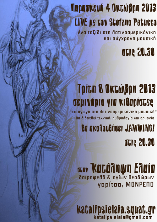 Την Παρασκευή 4/10, το Σάββατο 5/10 και την Τρίτη 8/10 στην Κατάληψη Ελαία θα πραγματοποιηθούν δύο εκδηλώσεις (μια συναυλία & μια θεατρική παράσταση) και ένα σεμινάριο.