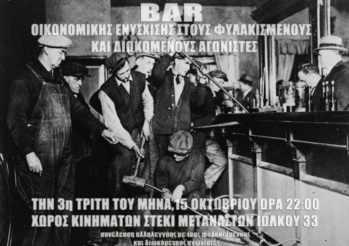 Αυτήν την Τρίτη και κάθε 3η Τρίτη του μήνα, θα πραγματοποιείται μπαρ οικονομικης ενίσχυσης σε φυλακισμένους και διωκόμενους αγωνιστές. Στο χώρο θα υπάρχει έντυπο υλικό και θα γίνονται προβολές.