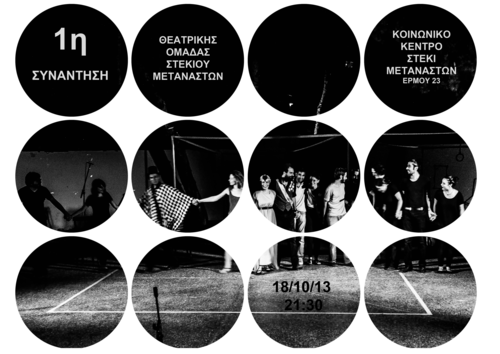Η Θεατρική Ομάδα Στεκιού Μεταναστών συναντιέται για τον προγραμματισμό της νέας θεατρικής χρονιάς και προσκαλεί όσους και όσες ενδιαφέρονται να συμμετέχουν, στην ανοιχτή συνάντηση την Παρασκευή 18 Οκτωβρίου στις 21:30 στο Κοινωνικό Κέντρο/Στέκι Μεταναστών (Ερμού 23 κ Βενιζέλου).