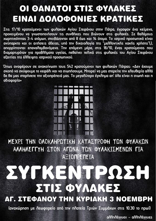 Στις 17/10 κρατούμενοι των φυλακών Αγίου Στεφάνου στην Πάτρα, έγραψαν ένα κείμενο, προκειμένου να γνωστοποιήσουν τις συνθήκες που βιώνουν στις φυλακές. Σε θαλάμους χωρητικότητας 3-4 ατόμων, στοιβάζονται από 8 έως και 14 άτομα. Το ιατρικό προσωπικό είναι ανύπαρκτο και οι αιτήσεις άδειας, υπό την δικαιολογία της "μελλοντικής κακής χρήσης"(;), απορρίπτονται επαναλαμβανόμενα. Την επόμενη μέρα, στις 18/10, ένας κρατούμενος που διαμαρτυρόταν για προβλήματα υγείας, πεθαίνει τελικά στις φυλακές του Αγίου Στεφάνου εξαιτίας της έλλειψης ιατρικού προσωπικού.