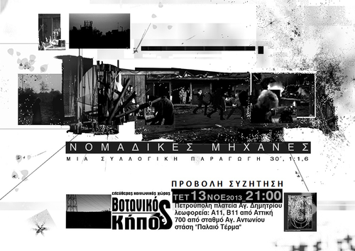 Το cine-votanikos στην κατάληψη του Βοτανικού Κήπου Πετρούπολης σας προσκαλεί στη προβολή της ταινίας ΝΟΜΑΔΙΚΕΣ ΜΗΧΑΝΕΣ και στη συζήτηση που θα ακολουθήσει με τους συντελεστές την Τετάρτη 13 Νοεμβρίου στις 21.00.