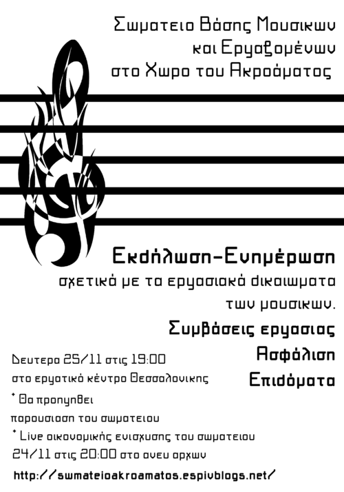 Επειδή το τοπίο σχετικά με τα εργασιακά δικαιώματα των μουσικών είναι αρκετά θολό, σαν σωματείο βάσης μουσικών και εργαζομένων στο χώρο του ακροάματος, αποφασίσαμε να διοργανώσουμε τη Δευτέρα 25/11 στις 19:00 στο εργατικό κέντρο Θεσσαλονίκης, μια εκδήλωση-ενημέρωση σχετικά με τα δικαιώματα μας (συμβάσεις εργασίας, ασφάλιση, επιδόματα κτλ). Προφανώς πιστεύουμε ότι η προάσπιση των δικαιωμάτων μας θα γίνει με συλλογικούς και αυτοοργανωμένους αγώνες. Γι αυτό καλούμε τους εργαζόμενους του κλάδου (εκτελεστές οργάνων, τραγουδιστές, καθηγητές μουσικής, ηχολήπτες, κτλ) να συμμετάσχουν στην εκδήλωση, έτσι ώστε να γνωριστούμε, να σπάσουμε την επαγγελματική μας απομόνωση, να συζητήσουμε τις συνθήκες εργασίας κάτω από τις οποίες δουλεύουμε και να προτείνουμε τρόπους παρέμβασης και δράσης.