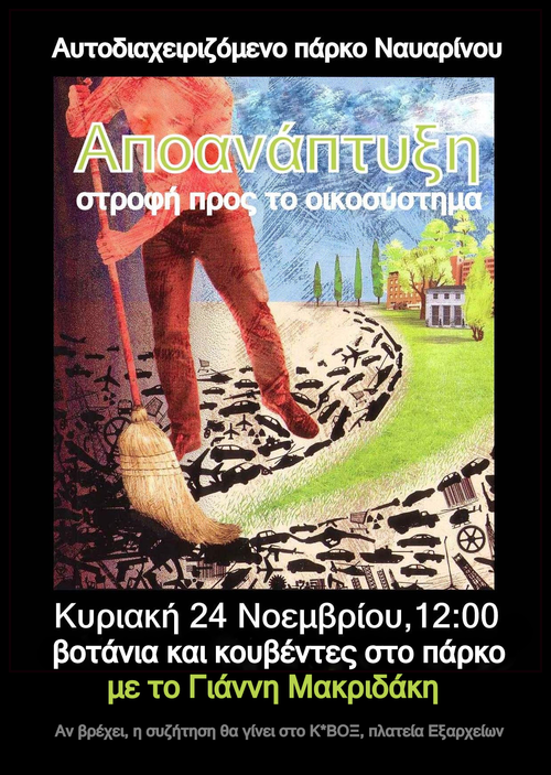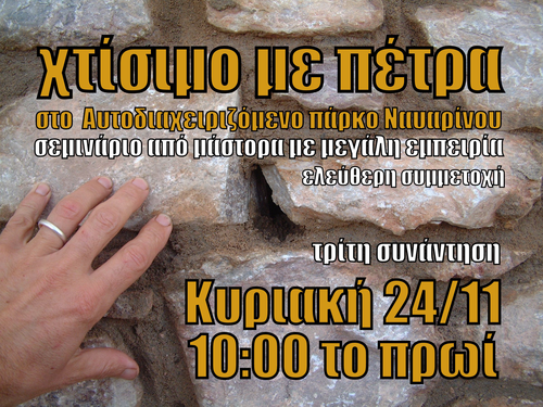 Αυτή την Κυριακή 10/11/13 στις 10.00 στο Πάρκο η τρίτη συνάντηση - σεμινάριο παραδοσιακού χτισίματος με πέτρα , ενώ στις 12.00 ακολουθεί ζεστό τσάι βοτάνων και κουβέντα για την Αποανάπτυξη με το Γιάννη Μακριδάκη (σε περίπτωση κακοκαιρίας η συζήτηση θα γίνει στο Κ*BΟΞ στην Πλατεία Εξαρχείων)
