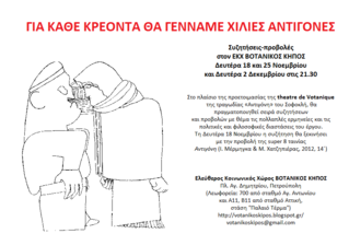 Στο πλαίσιο της προετοιμασίας της theatre de Votanique της τραγωδίας «Αντιγόνη» του Σοφοκλή, θα πραγματοποιηθεί σειρά συζητήσεων και προβολών με θέμα τις πολλαπλές ερμηνείες και τις πολιτικές και φιλοσοφικές διαστάσεις του έργου.