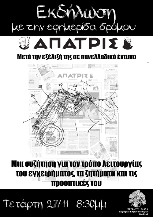 Την Τετάρτη 27/11, 8:30, στην Κατάληψη Ελαία, θα πραγματοποιηθεί εκδήλωση-παρουσίαση της εφημερίδας δρόμου "Άπατρις" από την Κρήτη, μετά την εξέλιξη της σε πανελλαδικό έντυπο.