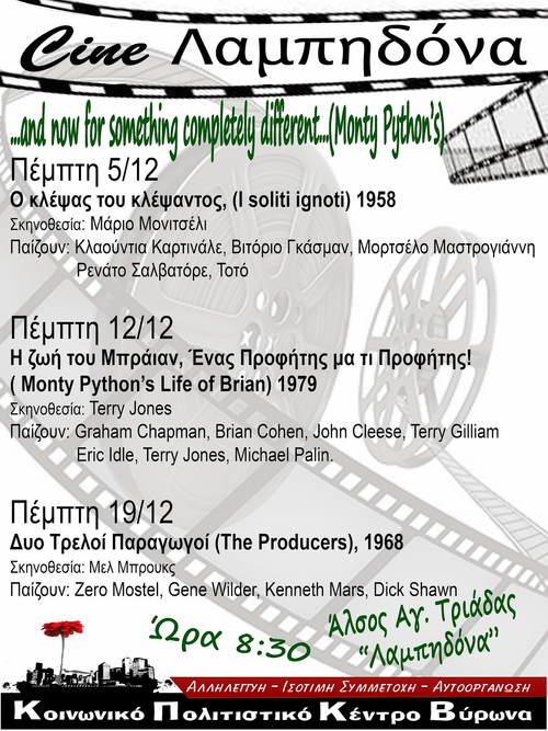 Η όμαδα προβολών του Κοινωνικού Πολιτιστικού Κέντρου Βύρωνα σας καλεί την Πέμπτη 12 Δεκέμβρη και ώρα 20:00 στην προβολή της ταινίας ''Η ζωή του Brian''