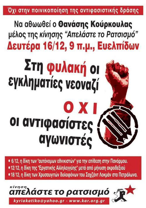 Στις 16 Δεκεμβρίου δικάζεται στο 4ο Μονομελές Πλημμελειοδικείο Αθηνών ο Θανάσης Κούρκουλας αγωνιστής του αντιφασιστικού και αντιρατσιστικού κινήματος, μετά από προκλητική συκοφαντική μήνυση ακροδεξιού που τον κατηγορεί πως τάχα ¨καθοδηγούσε ομάδα ροπαλοφόρων¨ που του επιτέθηκε το 2009. Η δίκη αυτή αποτελεί τμήμα μιας βιομηχανίας διώξεων που έστησαν τα τελευταία χρόνια οι νεοναζί, με στόχο να εκφοβίσουν και να στοχοποιήσουν ανθρώπους και οργανώσεις που αγωνίζονται ανοιχτά, μαζικά, στο φως της ημέρας για να ξηλωθεί η συμμορία της Χρυσής Αυγής και οι συνεργάτες της στους κρατικούς μηχανισμούς.
