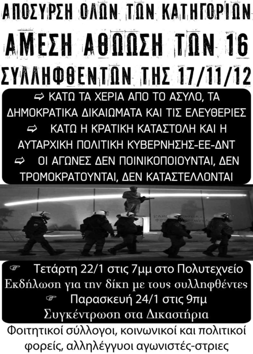 ΝΑ ΑΘΩΩΘΟΥΝ ΟΙ 16 ΣΥΛΛΗΦΘΕΝΤΕΣ ΤΗΣ 17/11/12