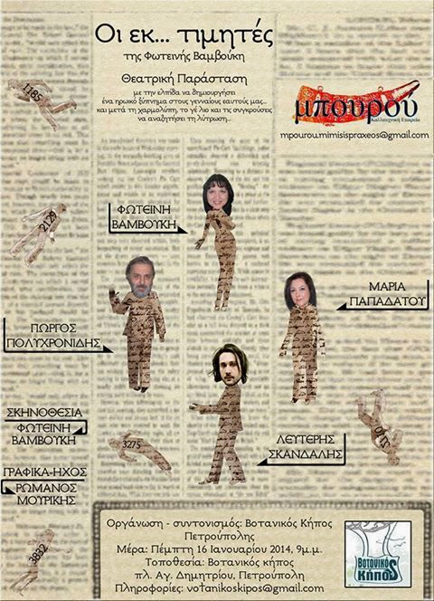 Η κατάληψη στον Ελεύθερο Κοινωνικό Χώρο «Βοτανικός Κήπος Πετρούπολης» και η θεατρική ομάδα «Μπουρού» σάς προσκαλούν την Πέμπτη 16 Ιανουαρίου 2014 και ώρα 21.00 στη θεατρική παράσταση «Οι εκ… τιμητές».