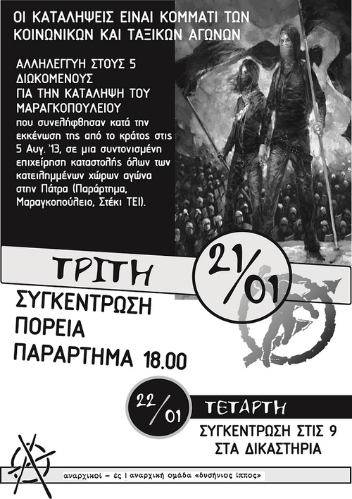 που συνελήφθησαν κατά την εκκένωση της από το κράτος στις 5 Αυγ. 13, σε μια συντονισμένη επιχείρηση καταστολής όλων των κατειλημμένων χώρων αγώνα στην Πάτρα (Παράρτημα, Μαραγκοπούλειο, Στέκι ΤΕΙ)