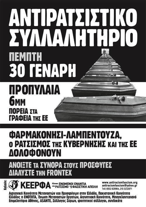 Η Ευρώπη-φρούριο, των κλειστών συνόρων, της FRONTEX και των στρατοπέδων συγκέντρωσης με τη στήριξη της κυβέρνησης Σαμαρά-Βενιζέλου δολοφονεί πρόσφυγες και μετανάστες στο βωμό της πιο άθλιας ρατσιστικής πολιτικής. Μια πολιτική που ανοίγει το δρόμο στο νεοναζισμό σε όλη την Ευρώπη.