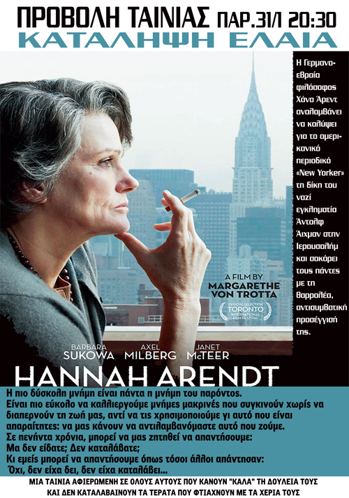 Η Γερμανο-εβραία φιλόσοφος Χάνα Άρεντ αναλαμβάνει να καλύψει για το αμερικανικό περιοδικό «New Yorker» τη δίκη του ναζί εγκληματία Άντολφ Άιχμαν στην Ιερουσαλήμ και σοκάρει τους πάντες με τη θαρραλέα, αντισυμβατική προσέγγισή της.
