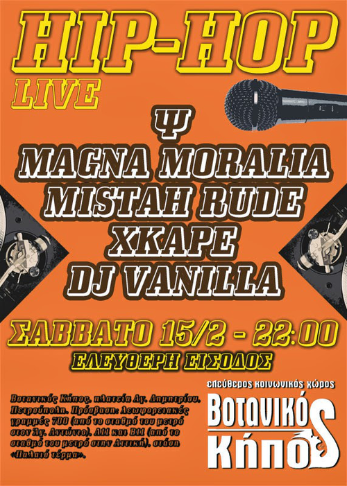 Το hip-hop, σαν είδος μουσικής, γεννήθηκε και διαμορφώθηκε αρχικά από DJ's της Νέας Υόρκης, μέσα στη δεκαετία του '70. Στα πρώτα του βήματα, οι DJ's πειραματίζονταν αναμιγνύοντας disco και funk τραγούδια, δημιουργώντας beats και scratches με τα πικάπ, ενώ αργότερα προστέθηκαν και τα φωνητικά (rap και beatbox) κάνοντας την εμφάνισή τους οι MC's. Γρήγορα έγινε ένα είδος μουσικής που παιζόταν σε clubs, σε σπίτια αλλά και σε πάρκα όπου οι νέοι ταυτόχρονα εμπνέονταν στο να εξασκηθούν στο graffiti και το break-dancing. Η ραπ μουσική, όπως αλλιώς ονομάζεται το hip-hop, εξελίχθηκε και συνεχίζει να εξελίσσεται παγκοσμίως όμως η αμεσότητα του λόγου, ο αυθορμητισμός και ο αυτοσχεδιασμός, όλα προϊόντα ελευθερίας της σκέψης, είναι τα συστατικά που παραμένουν χαρακτηριστικά αυτού του είδους μουσικής. Η ελευθερία της σκέψης αποτελεί μέρος του Βοτανικού Κήπου, του Ελεύθερου Κοινωνικού Χώρου που βρίσκεται στην Πετρούπολη. Εκεί, το Σάββατο 15/2 και ώρα 10 μ.μ., ο Ψ, οι Magna Moralia, ο Mistah Rude, οι Xkape και ο DJ Vanilla θα φέρουν beats, ρίμες, μελωδίες και scratches για μια hip-hop συναυλία για όλους. Είσοδος ελεύθερη.