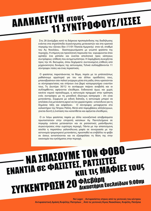Στις 28/12/13, κατά τη διάρκεια προπαγάνδισης πορείας ενάντια στα σύγχρονα στρατόπεδα συγκέντρωσης μεταναστών και τις επιχειρήσεις «ξένιος ζευς» και «θέτις», δεχθήκαμε συντονισμένη επίθεση από αστυνομικές δυνάμεις στην πλατεία βικτωρίας, με αποτέλεσμα δώδεκα συλλήψεις, έντεκα συντρόφων/ισσών μας και ενός περαστικού. Αφορμή της επίθεσης ήταν το επεισόδιο που είχε προηγηθεί στην περιοχή του αγ. νικολάου, όταν γνωστός φασίστας της περιοχής μας προκάλεσε και μας επιτέθηκε με ρόπαλο· επίθεση που αντιμετωπίστηκε. Η συνέχεια εκτυλίχθηκε στη ΓΑΔΑ, με το στήσιμο του κατηγορητηρίου για τους συλληφθέντες και τον ορισμό του αυτοφώρου στις 30/12. Ενώ όμως η δίκη αναβάλλεται και η έδρα δίνει εντολή να αφεθούν ελεύθεροι όλοι οι συλληφθέντες, οι μπάτσοι αποφασίζουν να κρατήσουν έναν εξ αυτών γιατί είναι... μετανάστης, κρίνοντας αυτόματα -με βάση ειδική νομοθετική διάταξη- ότι είναι «επικίνδυνος για τη δημόσια τάξη και ασφάλεια». Μεταφέρεται λοιπόν στο κέντρο κράτησης μεταναστών της Π. Ράλλη όπου, έπειτα από παρέμβαση αλληλέγγυων, γίνεται δεκτή η ένσταση που κατατίθεται και αφήνεται ελεύθερος.