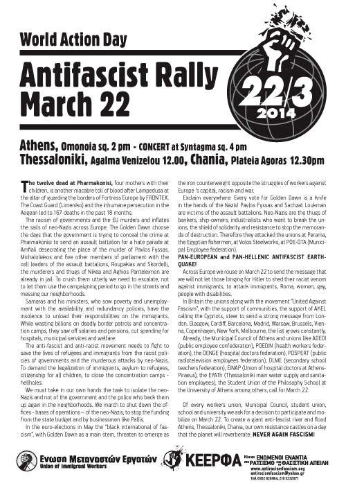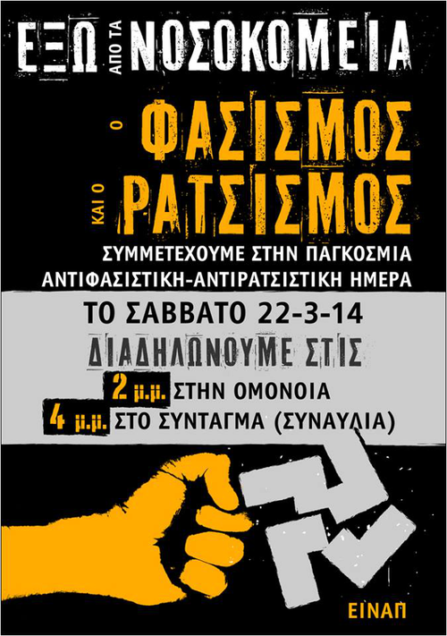 Στηρίζουμε και συμμετέχουμε στις κινητοποιήσεις στα πλαίσια της Παγκόσμιας Μέρας Δράσης κατά του Φασισμού και Ρατσισμού το Σάββατο 22 Μάρτη και καλούμε όλους τους εργαζόμενους και τα σωματεία στην Αθήνα να συμμετάσχουν ενεργά στο: