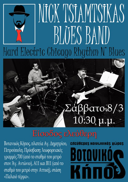 Η συλλογικότητα της κατάληψης Ελεύθερος Κοινωνικός Χώρος Βοτανικός Κήπος σας καλεί το Σάββατο 8 Μαρτίου στις 22.30 στη συναυλία των Nick Tsiamtsikas Blues Band με Hard Electric Chicago Rhythm n' Blues.