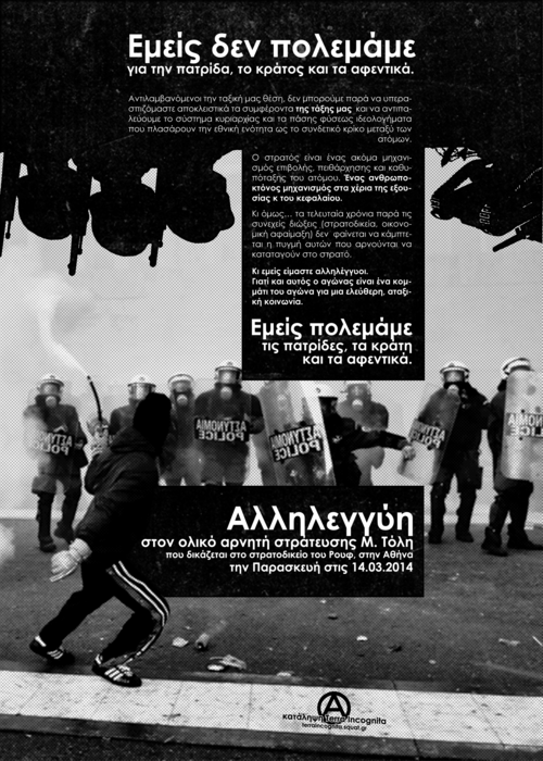 «Η απάντηση μας στην καταστολή τους είναι η αλληλεγγύη μας σε όποιον επιλέγει να σταθεί ενάντια στον μηχανισμό του στρατού και η ενδυνάμωση του αντιμιλιταριστικού αγώνα, συλλογικά και δημόσια.»