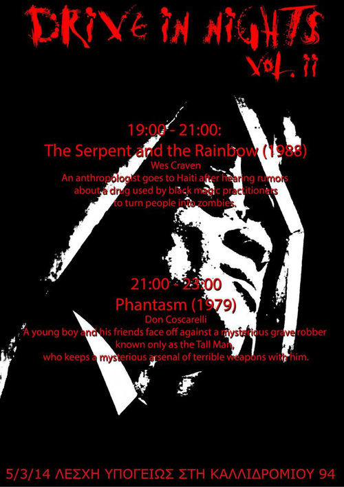Την Τετάρτη 5/3/2014 και ώρα 19:00, στη Λέσχη υπογείως στη Καλλιδρομίου 94 θα έχουμε την δεύτερη DRIVE IN NIGHT με δύο ταινίες.