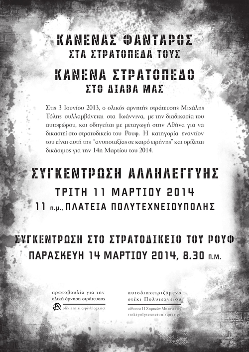 Στις 3 Ιουνίου 2013, ο ολικός αρνητής στράτευσης Μιχάλης Τόλης συλλαμβάνεται στα Ιωάννινα, με την διαδικασία του αυτοφώρου, και οδηγείται με μεταγωγή στην Αθήνα για να δικαστεί στο στρατοδικείο του Ρουφ. Η κατηγορία εναντίον του είναι αυτή της "ανυποταξίας σε καιρό ειρήνης" και ορίζεται δικάσιμος για την 14η Μαρτίου του 2014.