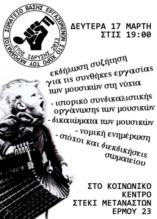 Τη Δευτέρα 17 Μάρτη στις 19:00 στο Κοινωνικό Κέντρο Στέκι Μεταναστών θα πραγματοποιηθεί εκδήλωση-συζήτηση από το Σωματείο Βάσης Εργαζομένων στο Χώρο του Ακροάματος με θέματα: Ιστορικό συνδικαλιστικής οργάνωσης των μουσικών, νομική ενημέρωση, στόχοι και διεκδικήσεις του σωματείου.