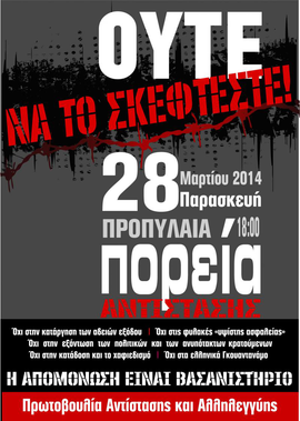 - Καλούμε στην διαδήλωση ενάντια στη δημιουργία φυλακών νέου τύπου που οργανώνει η Πρωτοβουλία Αντίστασης και Αλληλεγγύης την Παρασκευή 28 Μαρτίου στις 6 μ.μ. στα Προπύλαια.