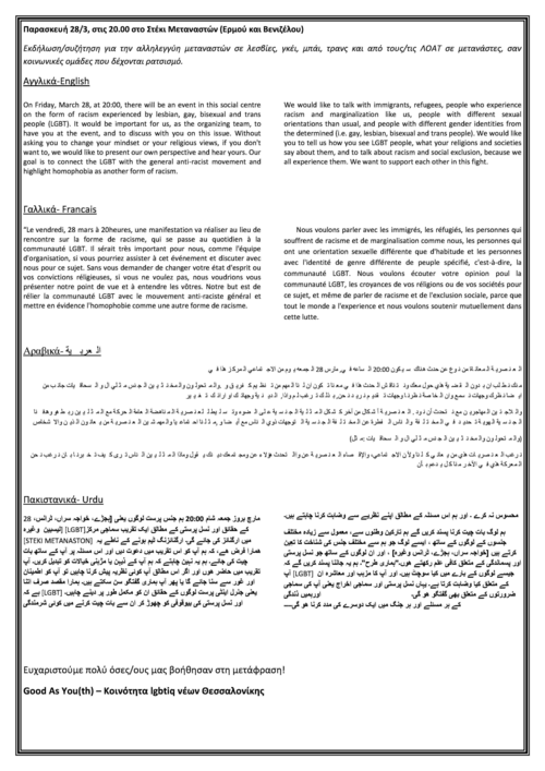 Εκδήλωση/συζήτηση για την αλληλεγγύη μεταναστών σε ΛΟΑΤ