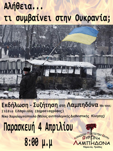 Το Κοινωνικό Πολιτιστικό Κέντρο Βύρωνα σας προσκαλεί την Παρασκευή 4 Απρίλη και ωρα 20:00 στην Λαμπηδόνα στην εκδήλωση με θεμα ''Αληθεία...τι συμβαίνει στην Ουκρανία;''.