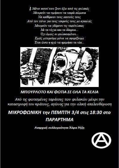 Από τις αρχές της δεκαετίας του ΄90 και την εξέγερση στις φυλακές Αλικαρνασσού που πυροδότησε τις εξεγέρσεις που σάρωσαν απ' άκρη σ' άκρη τις φυλακές της χώρας, τις εξεγέρσεις που ξεκίνησαν μετά τον ξυλοδαρμό του συντρόφου Γιάννη Δημητράκη στα κάτεργα του Μαλανδρίνου τον Απρίλη του 2007 και τις καθημερινές ατομικές και συλλογικές πράξεις αντίστασης των κρατουμένων δίνεται το μήνυμα. Μήνυμα αντίστασης απέναντι σε κάθε μορφή εξουσίας ακόμη και αν βρίσκεσαι στα χέρια του εχθρού. Ένα μήνυμα που σπάει τον φόβο που καλλιεργείται από τους εξουσιαστές και περνάει τους τοίχους των φυλακών. Είναι η θρυαλίδα της έκρηξης απέναντι στα τείχη που χτίζει το κεφάλαιο και το κράτος. Οι φυλακισμένοι δεν είναι μόνοι τους. Μετά την κρατική δολοφονία του Ηλία Καρέλι, οι αφέντες και οι φυλακές τους θα μας βρουν μπροστά τους. Η αλληλεγγύη και ο αγώνας μας δεν είναι για τους φυλακισμένους. Είναι με τους φυλακισμένους ενάντια στον κοινό εχθρό. Όσο εντείνεται η καταστολή τόσο θα οξύνονται οι αντιστάσεις σε όλα τα μέτωπα. Από τις φωτισμένες ταράτσες των φυλακών μέχρι την καταστροφή του κράτους, αγώνας για την ολική απελευθέρωση.