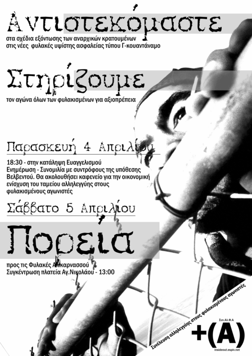 - Παρασκευή 4/4: Εκδήλωση-Συζήτηση για τις φυλακές υψίστης ασφαλείας και το ειδικό καθεστώς κράτησης με τηλεφωνική επικοινωνία με πολιτικούς κρατούμενους(με κρατούμενους συντρόφους για την υπόθεση του Βελβεντού) στην Κατάληψη Ευαγγελισμού. Η εκδήλωση θα ξεκινήσει στις 18:30 αυστηρά.