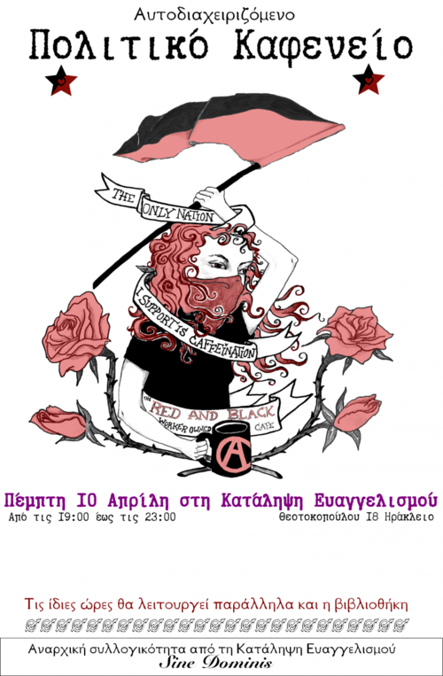 Πολιτικό καφενείο κατάληψης Ευαγγελισμού. Πέμπτη 10 Απρίλη 2014. από τις 19:00 ως τις 23:00. Παράλληλα θα λειτουργεί και η βιβλιοθήκη της κατάληψης.