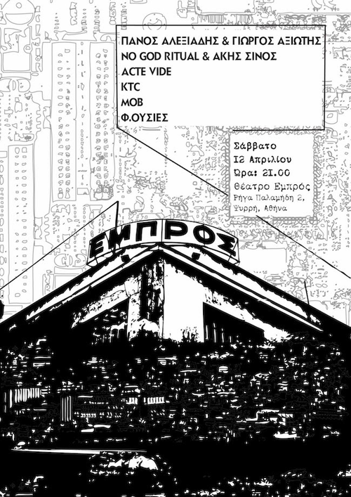 Το Σάββατο 12 Απριλίου, δέκα νέοι μουσικοί τhς ανεξάρτητης αυτοσχεδιαστικής μουσικής θα εμφανιστούν στην σκηνή του αυτό-διαχειριζόμενου Θεάτρου Εμπρός (Ρήγα Παλαμήδη 2, Ψυρρή, Αθήνα).