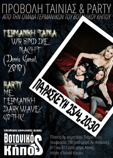 Η Ομάδα Γερμανικών και η συλλογικότητα της κατάληψης Ελεύθερος Κοινωνικός Χώρος ΒοτανικόςΚήπος Πετρούπολης σας καλούν την Παρασκευή 25 Απριλίου στις 20.30στην προβολή της ταινίας "Wir sind die Nacht (Είμαστε η νύχτα)" και στο πάρτυ με γερμανική dark wave / gothicμουσική, που θα ακολουθήσει.
