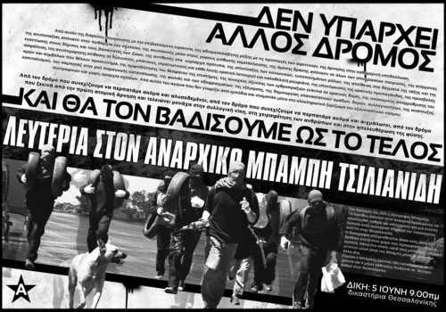 Ο σύντροφος Μπάμπης Τσιλιανίδης, όπως και πολλοί άλλοι αναρχικοί αρνείται να παρευρεθεί στη δίκη του. Η απουσία του αποτελεί συνειδητή επιλογή και άρνηση νομιμοποίησης του δικαστικού μηχανισμού. Επίσης υπάρχουν σύντροφοι, που επιλέγουν να παρευρεθούν στο δικαστήριο τους και να χρησιμοποιήσουν τη δικαστική διαδικασία ως βήμα, για να εκφράσουν τις ιδέες τους, να διαχύσουν τον αναρχικό λόγο , για να υπερασπιστούν τις πρακτικές του αγώνα, για να καταδείξουν τις αστυνομικές και δικαστικές αυθαιρεσίες , για να αναδείξουν τη βαρβαρότητα αυτού του συστήματος .