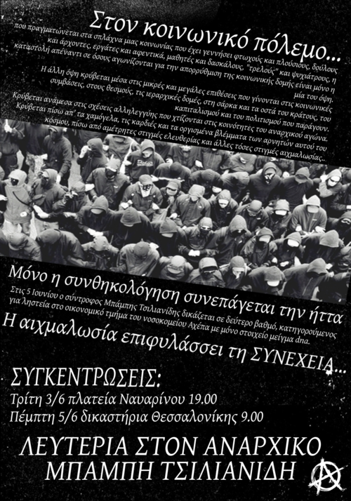 Στις 5 Ιουνίου ο σύντροφος Μπάμπης Τσιλιανίδης δικάζεται σε δεύτερο βαθμό, κατηγορούμενος για ληστεία στο οικονομικό τμήμα του νοσοκομείου Αχέπα με μόνο στοιχείο μείγμα dna.