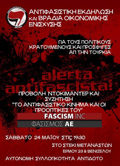Θα γίνει προβολή του ντοκιμαντέρ ΦΑΣΙΣΜΟΣ Α.Ε. ενώ θα υπάρξει κουτί οικονομικής ενίσχυσης για τους πολιτικούς κρατούμενους και πρόσφυγες απ΄την Τουρκία που μάχονται ενάντια στο Φασιστικό κράτος της Τουρκίας αλλά και το φασισμό σε κάθε γωνιά του πλανήτη.
