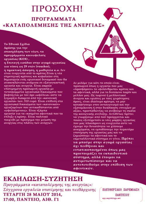 Το Εθνικό Σχέδιο Δράσης για την απασχόληση των νέων, τα προγράμματα κοινωφελούς εργασίας (ΚΟΧ) , η Επιταγή εισόδου στην αγορά εργασίας για νέους ως 29 ετών (voucher), η πρακτική άσκηση, η μαθητεία κ.α. δεν είναι ευεργεσία από το κράτος.Είναι η νέα στρατηγική κράτους και κεφαλαίου στη δημιουργία ενός εργατικού δυναμικού που θα ανακυκλώνεται ανάμεσα σε εξαναγκαστική εργασία και ανεργία. Είναι ακραία υποτιμημένη προσωρινή εργασία με πετσοκομμένα εργασιακά δικαιώματα που βαφτίζεται με τον όρο «ωφέλεια» ώστε να ξεχωρίζει διακριτά από την «κανονική εργασία» των..510 ευρώ. Είναι επίθεση στα εργασιακά δικαιώματα των «κανονικών» εργαζομένων που αντικαθίστανται από «ωφελούμενους». Είναι τζάμπα εργασία για τα «καημένα αφεντικά που τα έπληξε η κρίση». Είναι πολιτικό παιχνίδι με πρόσχημα την μείωση της ανεργίας στις πλάτες των ανέργων.