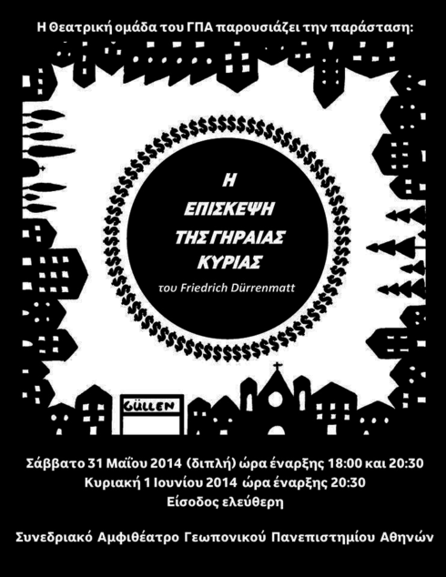 Δευτέρα 2 Ιουνίου 2014 στις 09:00 μ.μ. "Η επίσκεψη της γηραιάς κυρίας" του Φρίντριχ Ντύρενματ απο την ομάδα θεάτρου του Γεωπονικού Παν/μίου Αθηνών