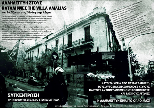 Το πρωί της Πέμπτης 20 Δεκέμβρη 2012 πραγματοποιήθηκε ευρείας έκτασης αστυνομική επιχείρηση στην κατάληψη Villa Amalias στην Αθήνα. Οι μπάτσοι, με πρόσχημα καταγγελίες "για διακίνηση ναρκωτικών" εισέβαλαν στο κατειλημμένο για 23 χρόνια κτίριο και συνέλαβαν 8 συντρόφους και συντρόφισσες που βρίσκονταν μέσα. Άμεσα, πλήθος κόσμου συγκεντρώθηκε έξω από την κατάληψη σε ένδειξη αλληλεγγύης στους καταληψίες και ενάντια στην απόπειρα τρομοκράτησης των αγωνιζόμενων ανθρώπων, ένα ακόμα επεισόδιο της οποίας διαδραματίστηκε εκείνη η τη μέρα. Συγκέντρωση διαμαρτυρίας πραγματοποιήθηκε και στο Δημαρχείο της Αθήνας, καθώς το κτίριο βρίσκεται στην ιδιοκτησία του Δήμου Αθηναίων, κατά τη διάρκεια της οποίας προσήχθησαν άλλοι 7 σύντροφοι και συντρόφισσες.