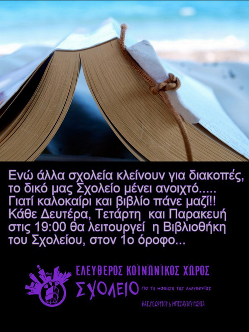 Κάθε Δευτέρα, Τετάρτη και Παρασκευή θα λειτουργεί από τις 19:00 μέχρι τις 21:00, η δανειστική βιβλιοθήκη/ αναγνωστήριο του Σχολείου.