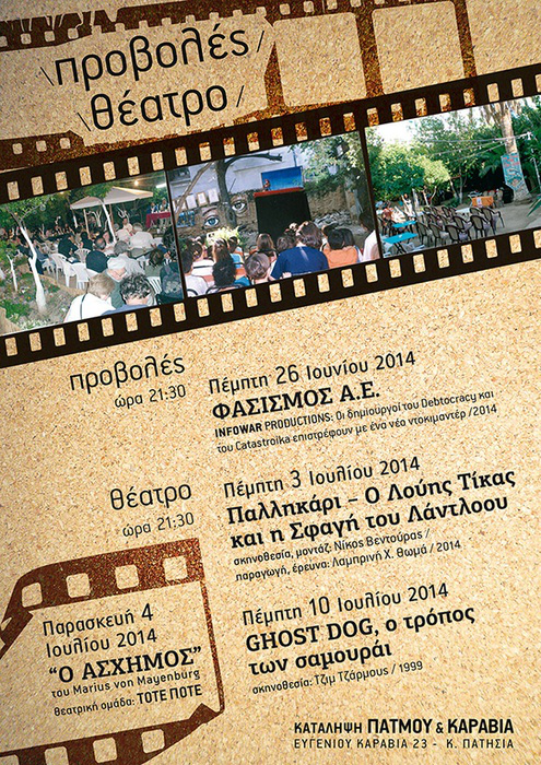 Κατάληψη Πάτμου & Καραβία Ευγενίου Καραβία 23, Κάτω Πατήσια (5' από ΗΣΑΠ Κάτω Πατήσια, Τρόλεϊ 3,5,11,14 & λεωφορεία Α8,608: στάση ΑΓΙΟΣ ΛΟΥΚΑΣ)
