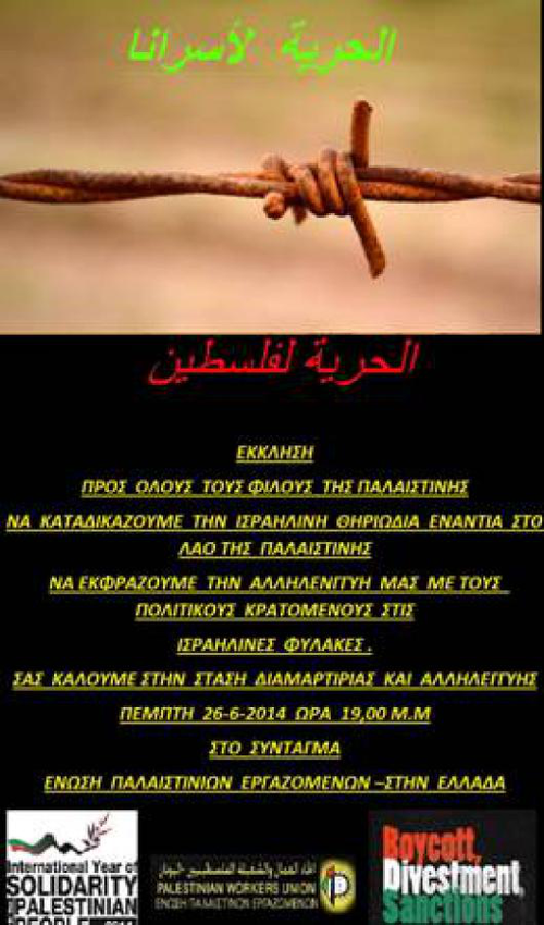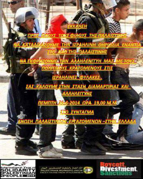 Σε συγκέντρωση στο Σύνταγμα, Πέμπτη 26/6 7 μ.μ. καλεί η Ένωση Παλαιστινίων Εργαζομένων