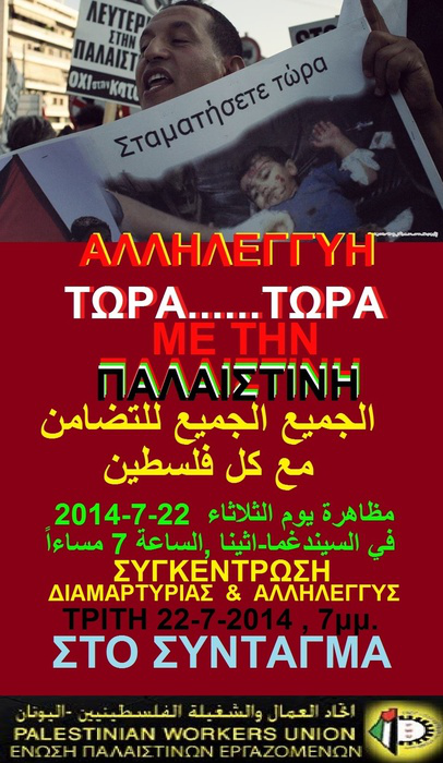 Καλούμε αλληλέγγυους, συνδικάτα, συλλόγους και συλλογικότητες σε συγκέντρωση διαμαρτυρίας την Τρίτη 22 Ιουλίου στις 7μμ στην πλατεία Συντάγματος και πορεία προς τα γραφεία της ΕΕ, για να διαδηλώσουμε την αντίθεση μας στη συνεχιζόμενη σφαγή στη Γάζα και να απαιτήσουμε από την ελληνική κυβέρνηση να διακόψει κάθε σχέση με το σιωνιστικό απαρτχάιντ.